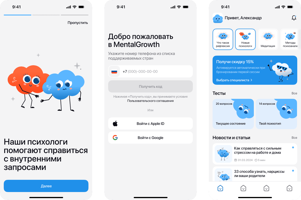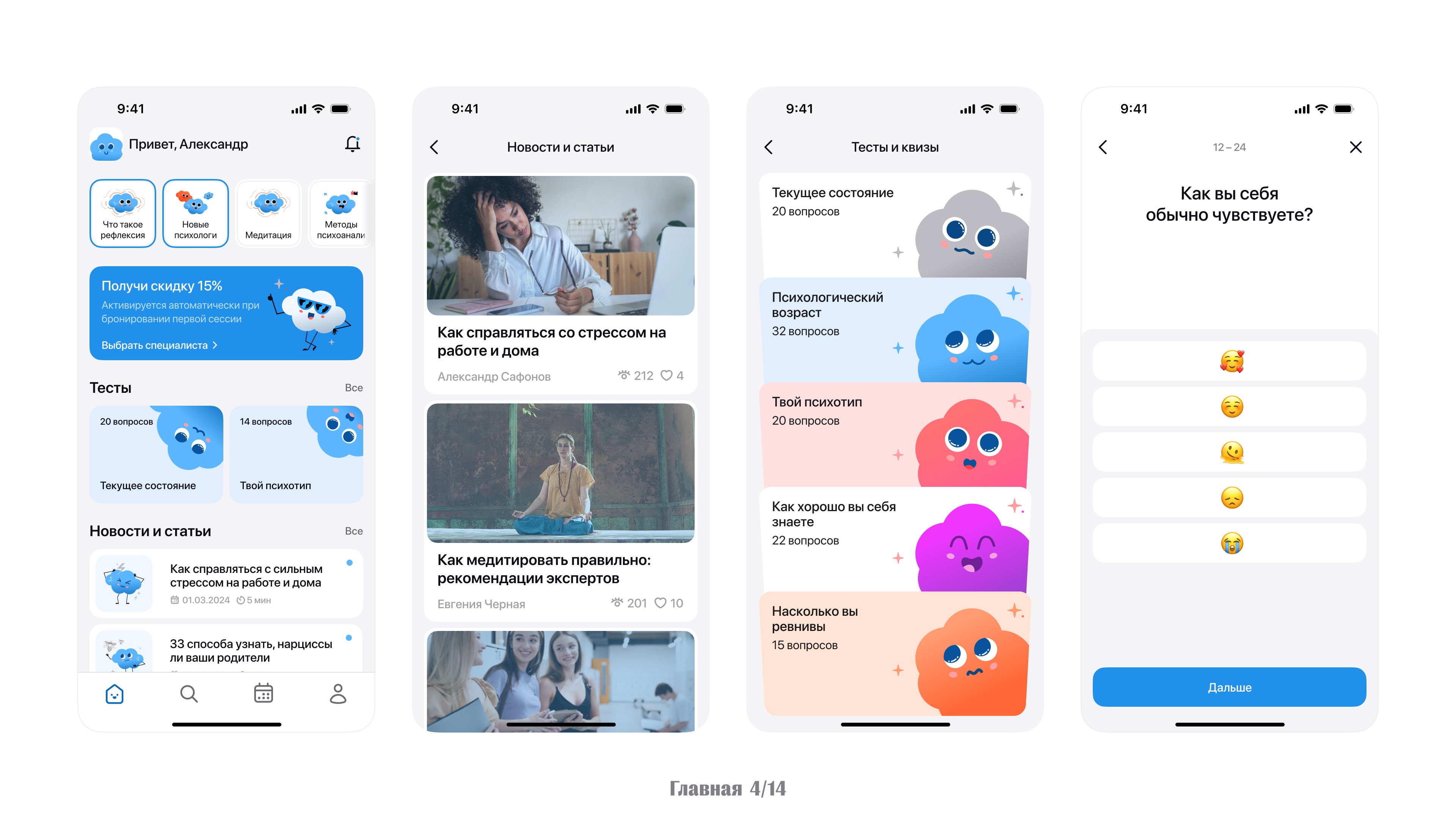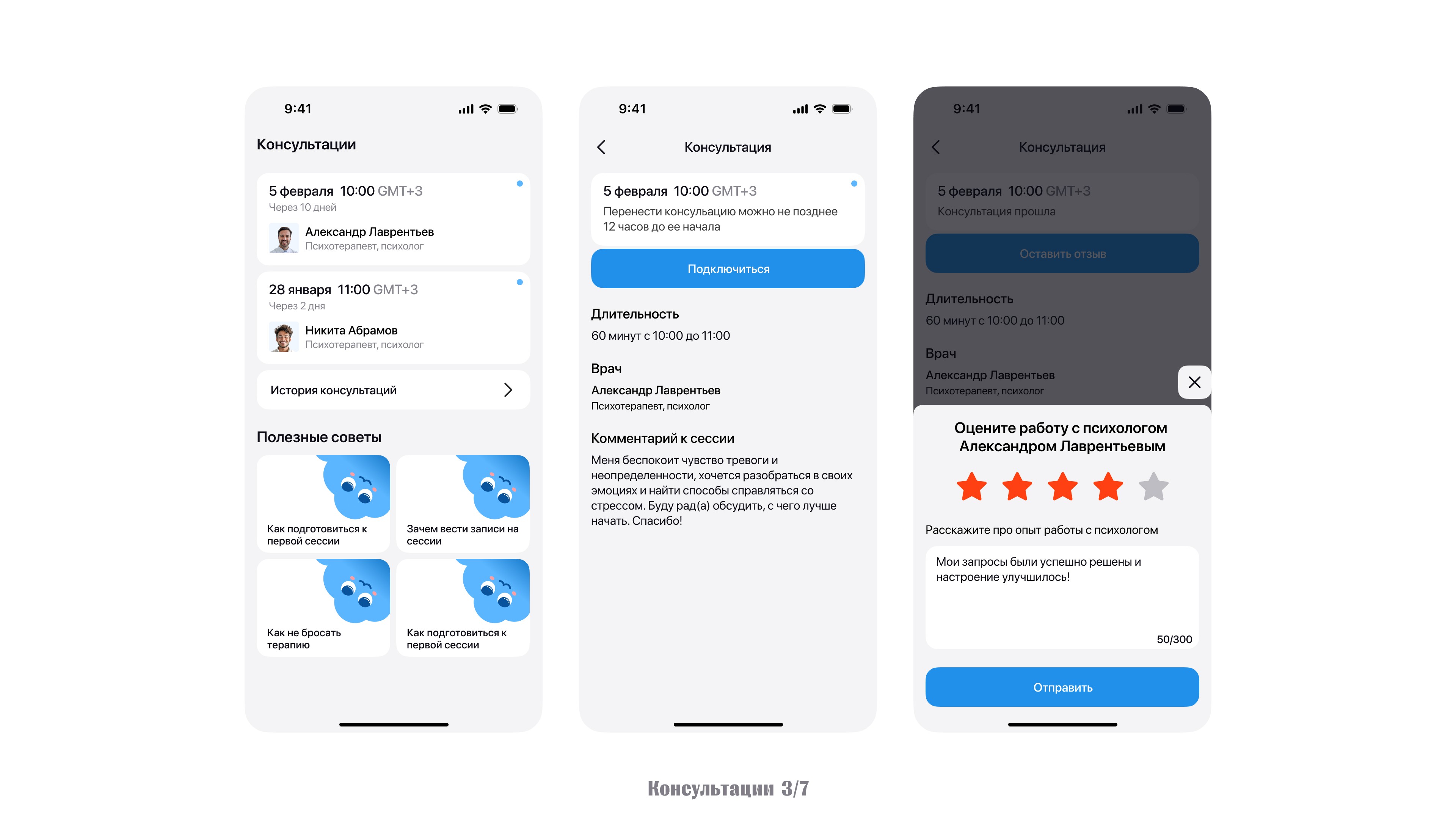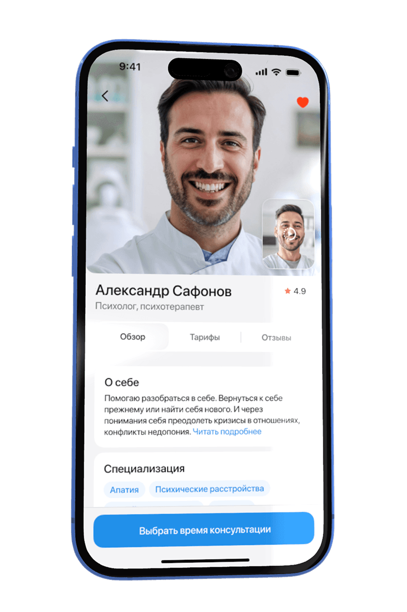 Приложение онлайн консультаций с психологами. В приложении можно записываться к психологам из доступного каталога, проходить тесты для выявления текущего психологического состояния и читать полезные статьи