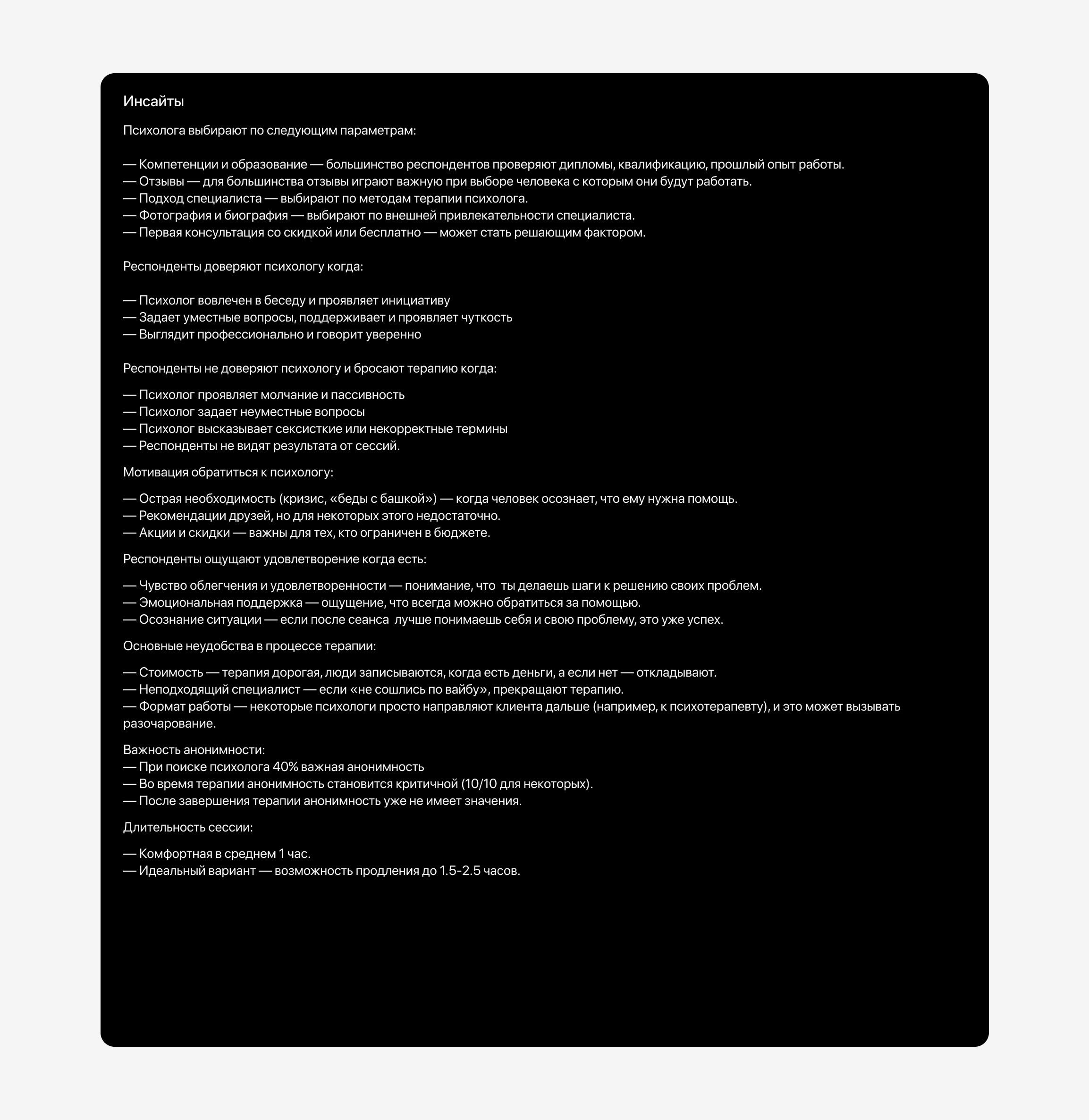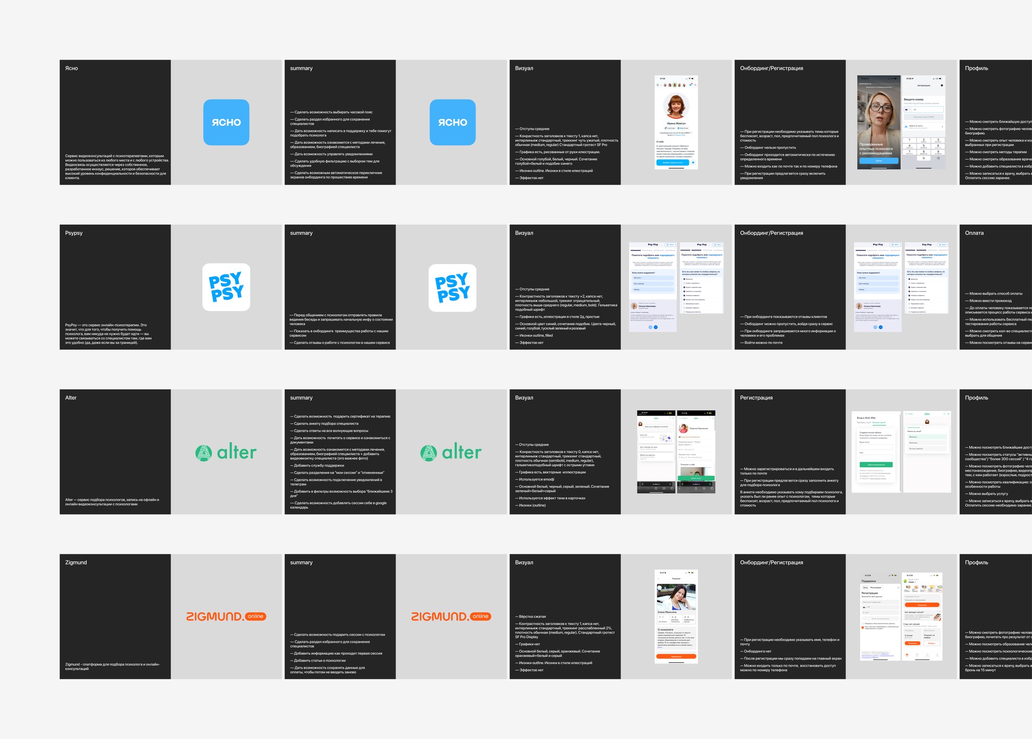 Составили бенчмарки, выявили основной функционал который есть у конкурентов. Часть выявленных функций взяли себе для дальнейших тестов. Рассматривали сервисы Ясно, Psypsy, Alter, Zigmund
