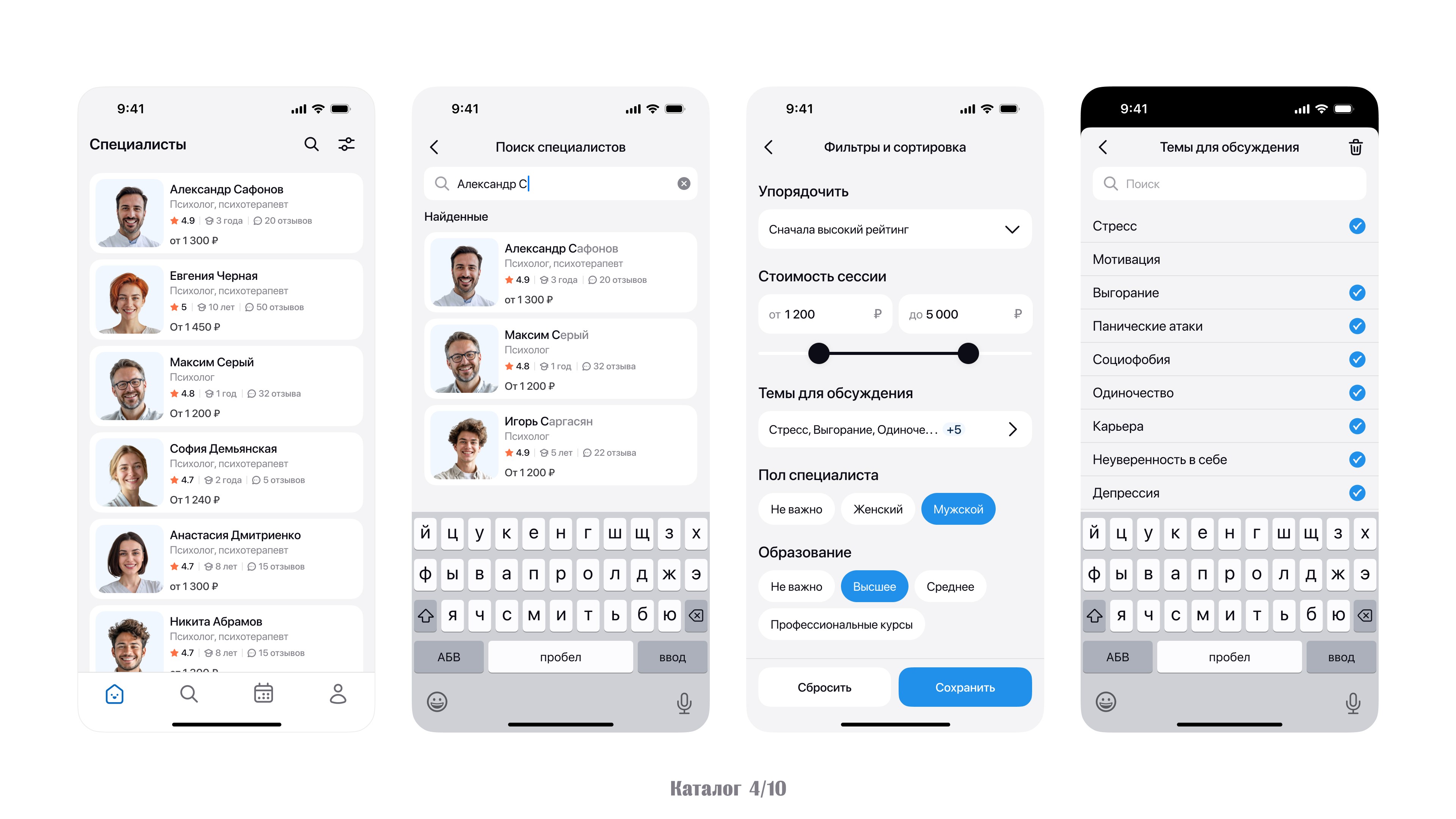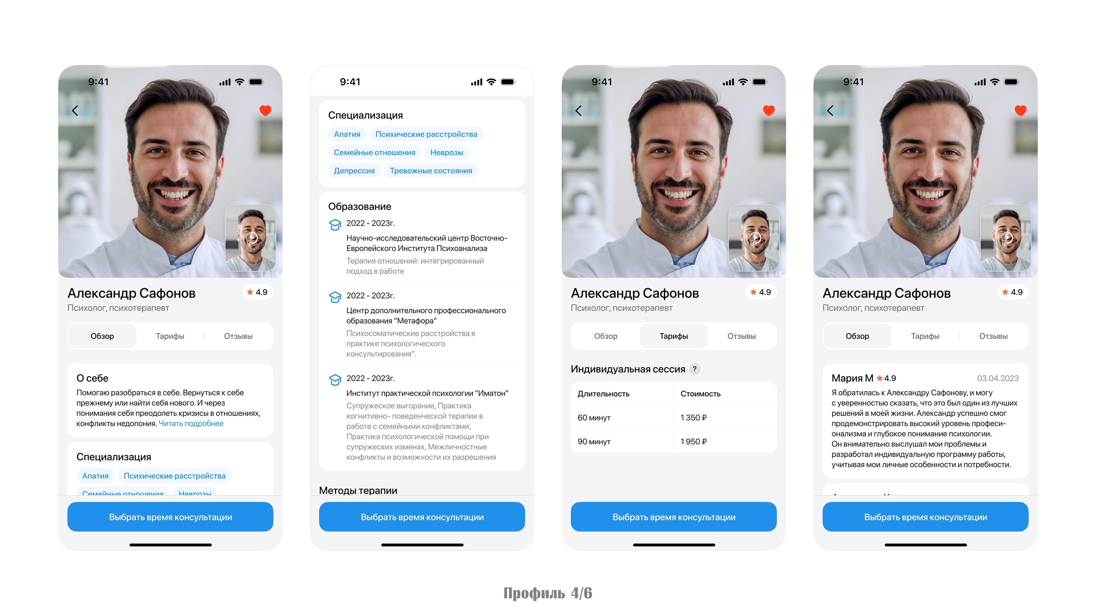 Провели UX-тестирование с целью выявить, насколько удобно и понятно пользователям взаимодействовать с интерфейсом нового приложения для онлайн-консультаций с психологами. Важно проверить, легко ли пользователи находят нужные функции (поиск специалиста, запись, фильтры, чат), не сталкиваются ли с затруднениями при навигации и оформлении записи, а также понять, какие элементы вызывают вопросы или неудобства. Провели на 6 респондентах