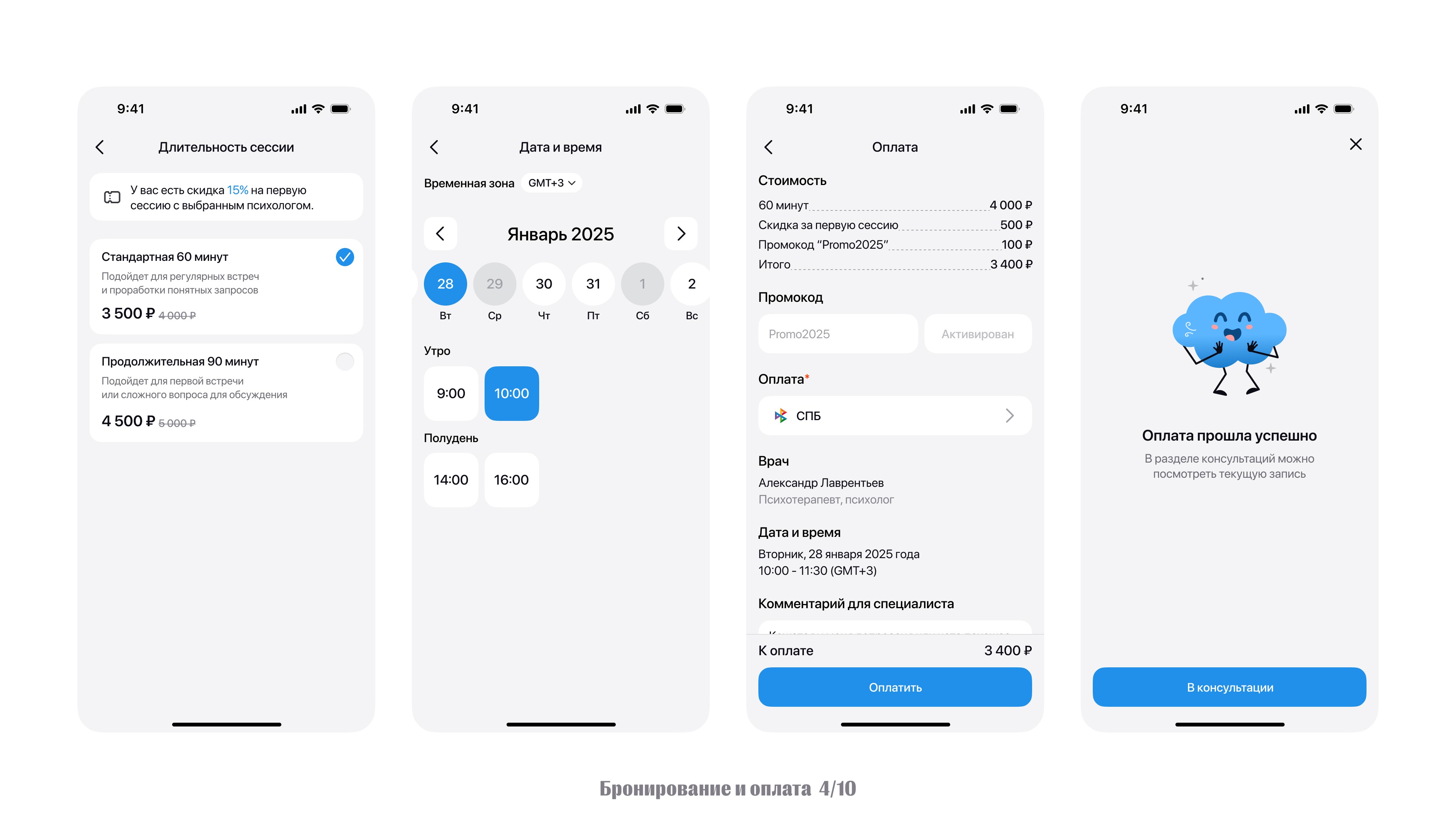 — Пользователь нажмет кнопку записаться в профиле врача, выберет дату, перейдет к оплате, и выбрав заданный метод оплатит сессию